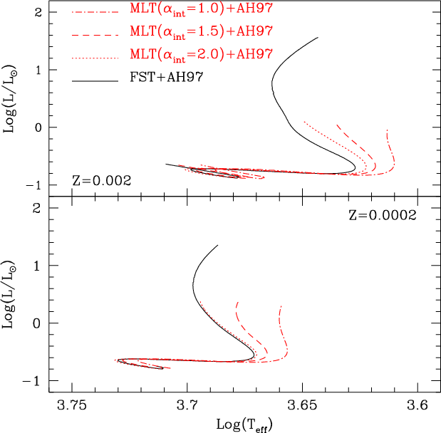 (Montalban et al. 2004). The evolutionary tracks computed with the MLT treatment of convection are indicated with dashed lines in Fig. 1; since the AH97 atmospheres are available only in the range of gravities