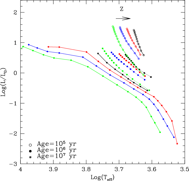 (D'Antona & Mazzitelli 1997). Young ages as low as 105 yr are also uncertain, because of the unclear role played by the protostellar accretion phase (Palla 2001). It is evident from the figure that at fixed age and luminosity more metal poor isochrones are hotter by an amount almost independent of luminosity and that these amounts became lower at lower metallicity. The effect is mostly due to the opacity reduction, as is well known in the study of main sequence models.