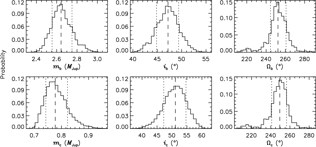 Figure 2: Probability distributions for the masses, inclinations, and longitudes of the ascending nodes for planets b and c from the MCMC analysis. The medians and two-sided 68.3% confidence limits are given by the dashed and dotted lines respectively. |
