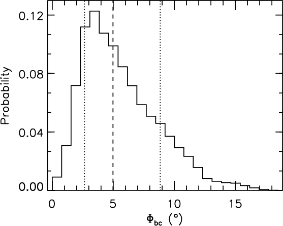 The MCMC parameter distributions for the masses, inclinations, and longitudes of the ascending nodes for planets b and c are shown in Fig. 2. As these plots demonstrate, the combined analysis of the radial velocity and astrometry data with the dynamical model yielded tight constraints on the masses and orbital orientations of the two planets. Using these probability distributions, we may calculate the probability distribution for the mutual inclination angle between their orbits directly. The result is shown in Fig. 3, and we find