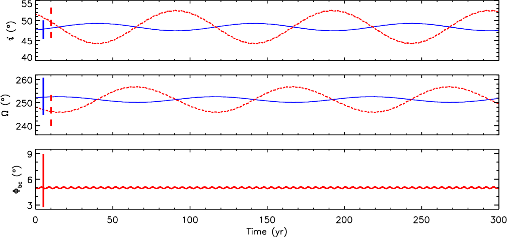 Figure 4: Long-term evolution of the projected orbital elements and mutual inclination for planets b (solid line) and c (dashed line). The variation is regular and continues in a similar fashion for at least 1 Myr. The bars on the left indicate the uncertainties in the osculating orbital elements used to initialize the simulation. |