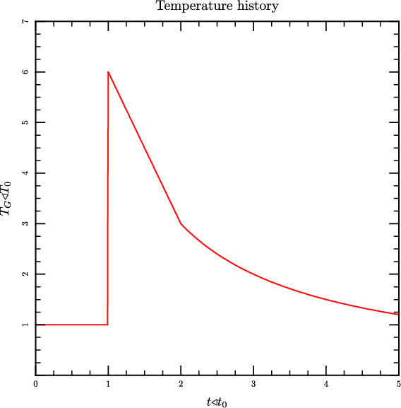 The approximate temperature history as a function of time t of an element of gas shocked at time t0. The graph shows a sketch of the plasma temperature, |