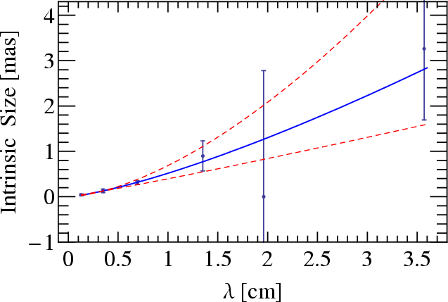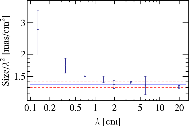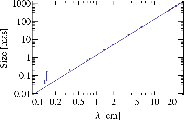 Figure 1: Measured radio source size (major axis) of Sgr A* as function of observing wavelength in centimeters. |