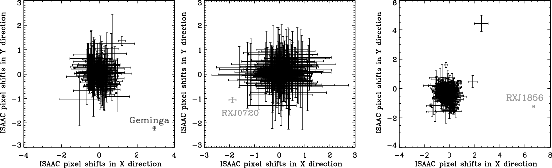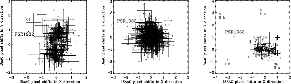 The middle plot shows the pixel shifts of the same objects, but for distortion-corrected  ISAAC and  SOFI images.