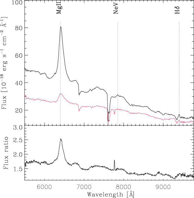 Figure 1: Spectra of the images of QJ 0158-4325. Top spectrum: image A. Bottom spectrum: image B. Bottom panel: ratio between the two spectra. |