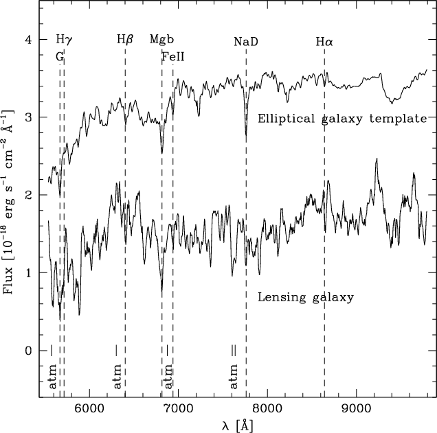 Figure 2: Spectrum of the lensing galaxy. The total integration time is 5000 s. The template spectrum of a redshifted elliptical galaxy at z=0.317 is shown for comparison (Kinney et al. 1996). Atmospheric absorptions are indicated by the label atm. |