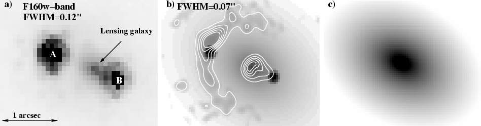 Figure 3: Deconvolution of QJ 0158-4325 images (F160W). North is to the top, east to the left. a) Original image. b) Deconvolved image: the quasar images A and B appear as point sources, the lensing galaxy is the sum of a de Vaucouleurs profile plus the residuals which are not fitted by the light profile. The white contours trace the light distribution of the smooth objects (quasar host galaxy and flux residuals of the lensing galaxy). c) de Vaucouleurs luminosity profile of the lensing galaxy, with a lower flux cut than in image b), in order to highlight its orientation and ellipticity. |