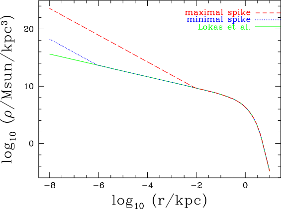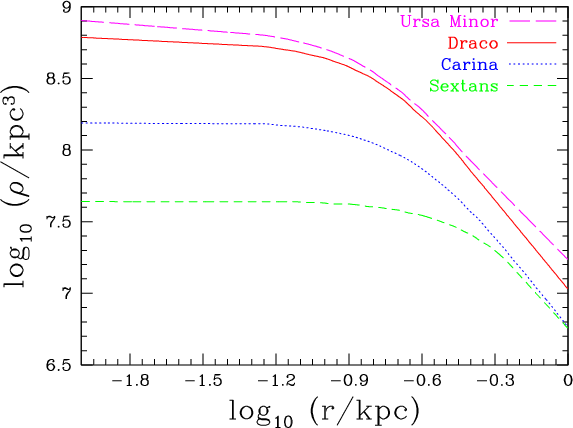 Figure 3: The radial profile of the DM mass density in Ursa Minor (long-dashed line), Draco (solid line), Carina (dotted line), and Sextans (short-dashed line) as derived by Gilmore et al. (2007). |