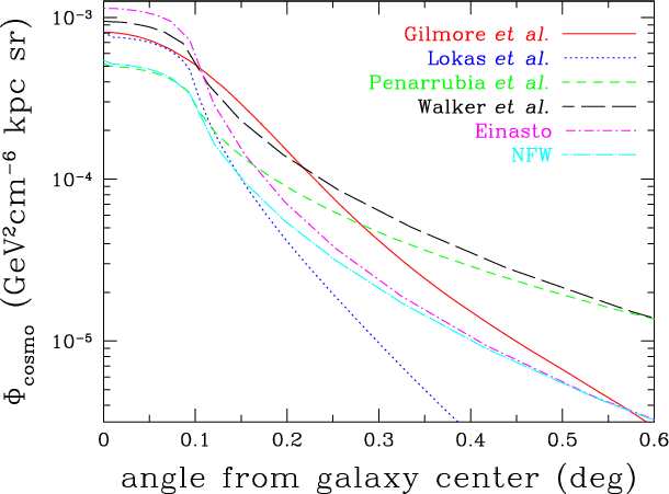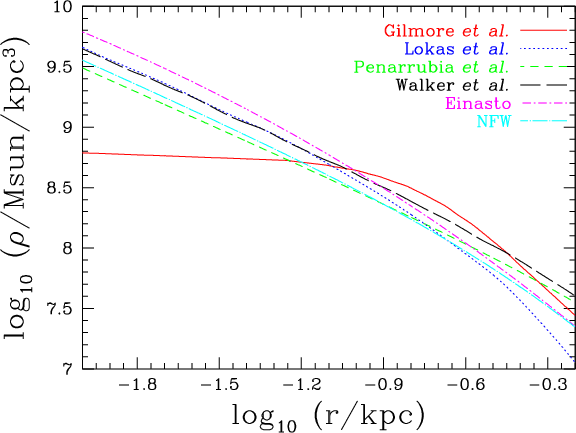 Figure 2: The radial profile of the DM mass density in Draco as derived by Gilmore et al. (2007) (solid line), okas et al. (2005) (dotted), Walker et al. (2007) (long-dashed), and Peñarrubia et al. (2008) (dashed). Also shown are the density profiles derived from numerical simulations, namely the standard NFW (long-long-dashed) and the Einasto (long-dot-dashed) radial profiles. |