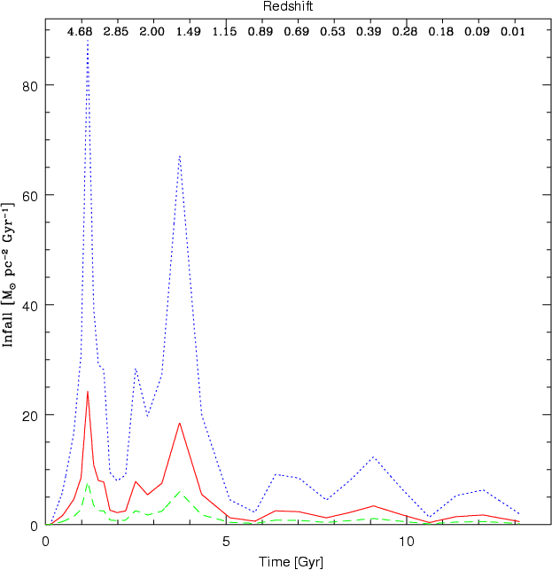 They are strongly influenced by both the star formation and the accretion history, because they are functions of galactocentric distance (see Matteucci & François 1989; Boissier & Prantzos 1999; Chiappini et al. 2001; Colavitti et al. 2008). Colavitti et al. (2008, hereafter C08), in particular, adopted a cosmologically motivated  infall law, that assumed an accretion law for baryons