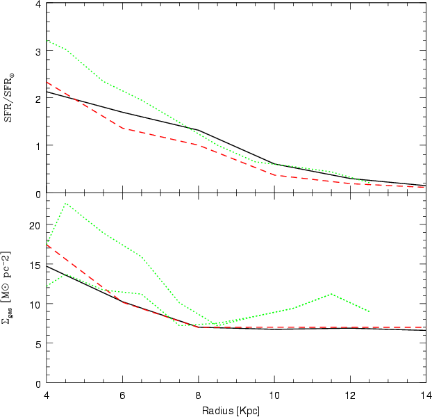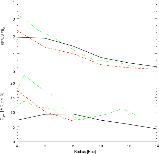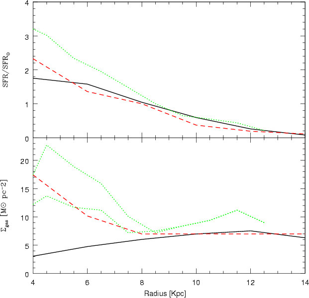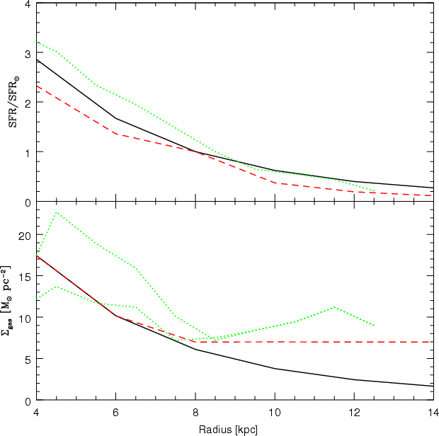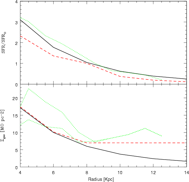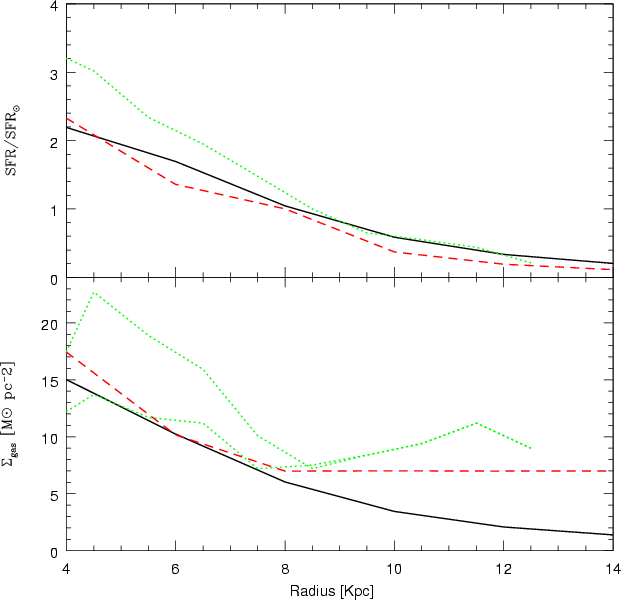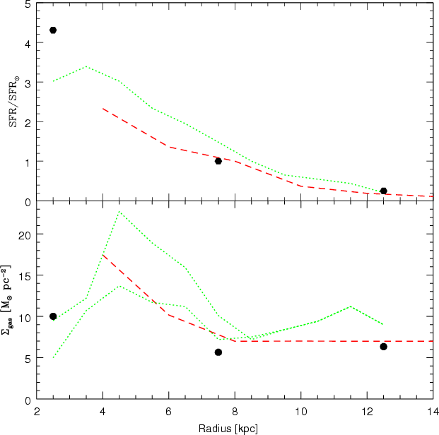 - A cosmological model without a threshold, and with a star formation efficiency that varies with radius and a simple inside-out prescription, can reproduce the SFR along the disk and the behavior of the surface gas density well. Moreover, it can reproduce the outer abundance gradients. In the inner part of the disk, it produces gradients that are too flat, even if the slope is steeper than for Model C08.