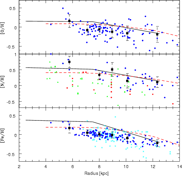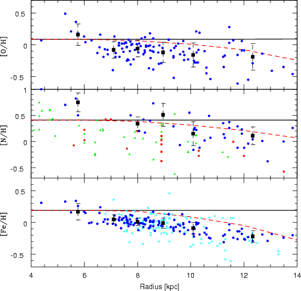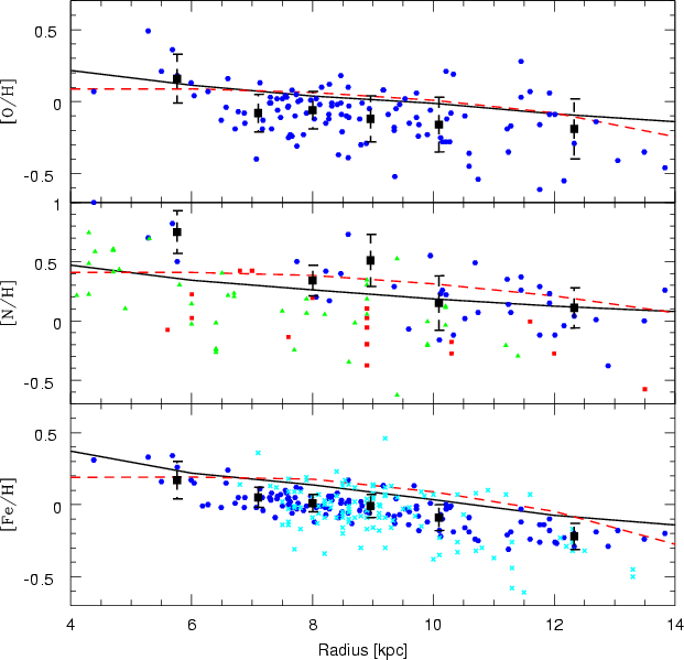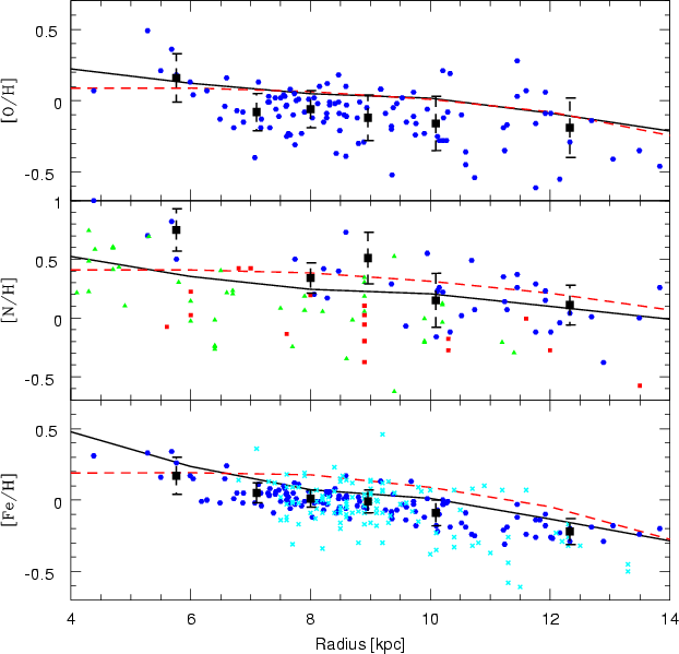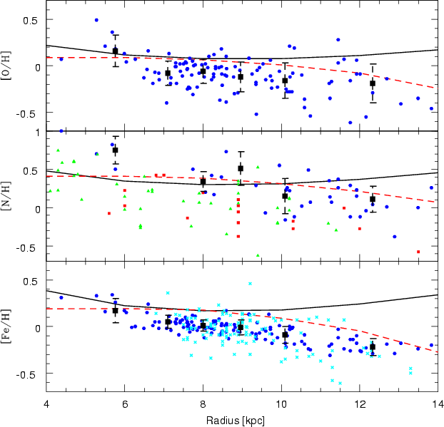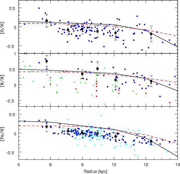 We also use data from Gummersbach et al. (1998, B stars), Simpson et al. (1995) and Afflerbach et al. (1997) for H II regions, and Chen et al. (2003), Carraro et al. (1998) and Twarog et al. (1997) for open clusters.