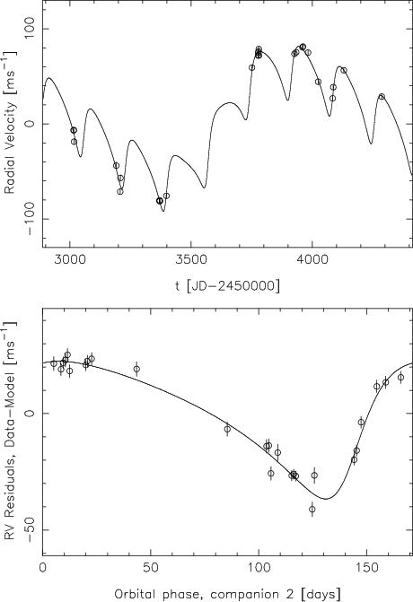 period could be present in the data but were unable to verify the existence of a second companion. This period corresponds to our two-companion solution (Table 2).