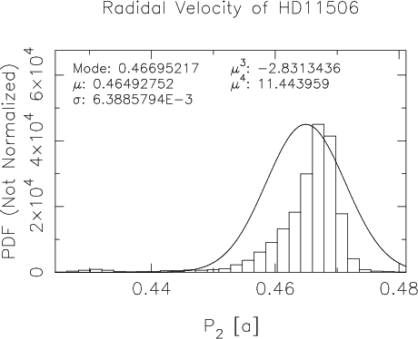 \end{figure}](/articles/aa/full_html/2009/11/aa11531-08/Timg32.gif) | Figure 2: The posterior probability density of parameter P2 and its mode, mean, deviation, and two higher moments. The solid curve is a Gaussian curve with the mean and variance of the density. |