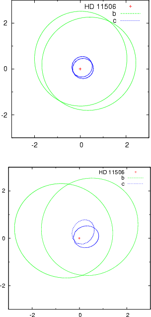 To present additional evidence of HD 11506 c, we selected 50 random combinations of parameters taken from the parameter probability densities. These values were used to simulate the dynamical behaviour of the planetary system by direct integration. A random example of these simulations is shown in Fig. 3 (top), where 100 000 yr excerpts are presented for two randomly selected parameter combinations. The orbital ellipses precess slowly but both the semimajor axis and the eccentricities remain almost constant during the evolution. This feature does not prove but suggests strongly that the two planetary companions orbiting HD 11506 provide a physically stable system.