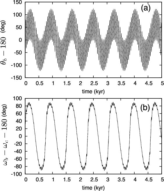 As in (Correia et al.  2009), both periastrons precess with mean frequency g1 that is retrograde, with a period of 754.701 years. The two periastrons are thus locked in an antipodal state, and the difference