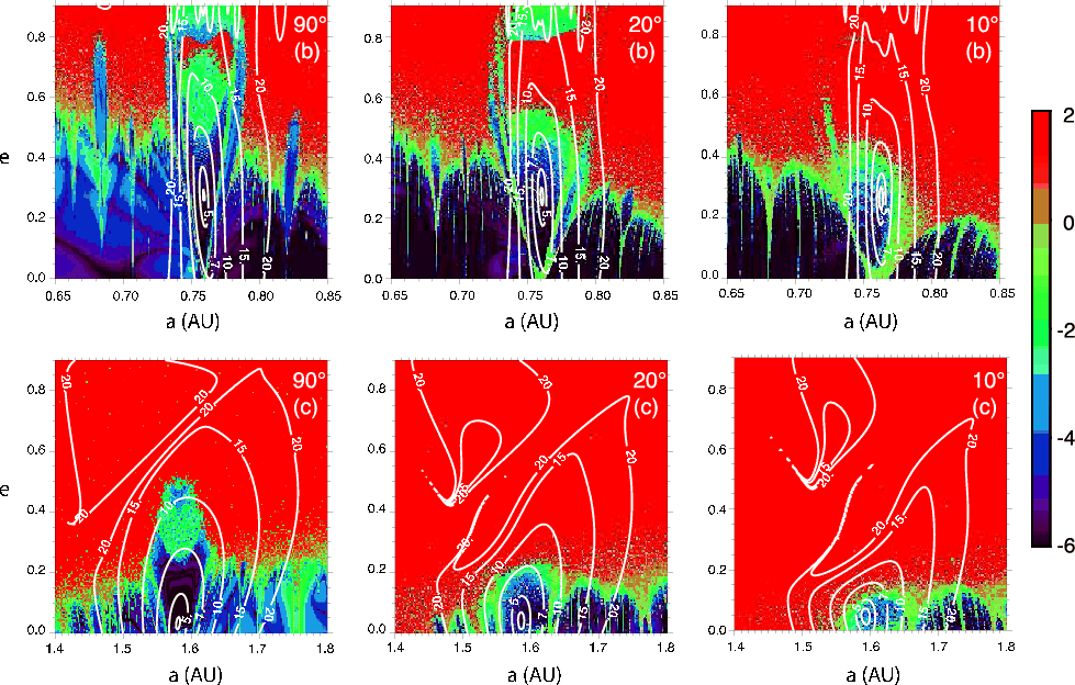 ). For a fixed orbital inclination and initial condition of the outer  and inner planet, the phase space of the system is explored by varying the semi-major axis ak and eccentricity ek of the other planet,  b) and  c) respectively. The step size is 0.002 AU in semi-major axis and 0.005 in eccentricity. For each initial condition, the full system is integrated numerically over 10 kyr and, as in (