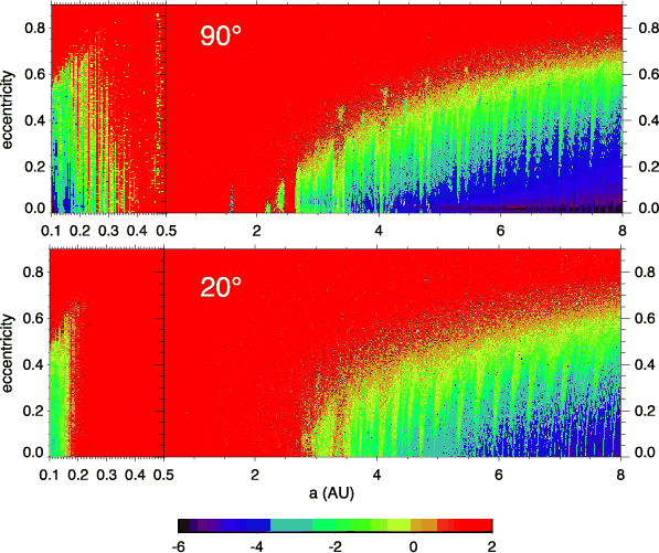 \end{figure}](/articles/aa/full_html/2009/11/aa11689-09/Timg71.gif) | Figure 3: Possible location of an additional planet in the HD 60532 system. For 90 ( top) and 20 degrees ( bottom) inclination, the stability of a small mass particle in the HD 60532 system is analyzed, for various semi-major axis and eccentricity, and for K=10-6 m/s. The stable zones where additional planets could be found are the dark blue regions. |