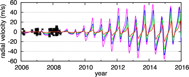 The planet-planet interactions in this system are important, because of this 3:1 resonance. The dependence of the libration period with the mass factor (Table 4) should allow determination of the inclination of the orbital planes and thus of the masses of both planets within the next decade (Fig. 4).