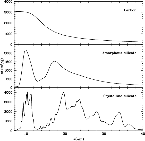 result from annealing of amorphous dust and other processes (see below). We therefore introduce new dust species for the calculation of the model spectra; in particular we need to consider both amorphous and crystalline particles. For the opacity of the crystalline material we use a