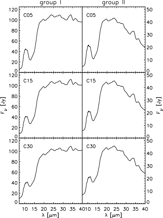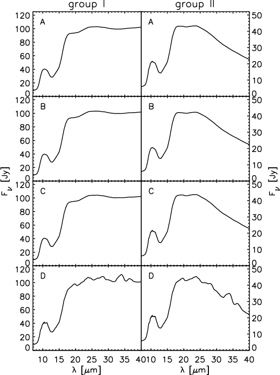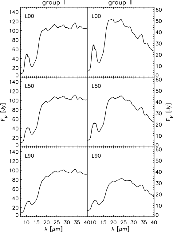 spectral shape is strongly affected by the mass in small grains. The group I spectra show higher flux levels than group II, reflecting the larger solid angle they subtend when viewed from the star. The spectral shape of group I and group II model spectra is rather similar in the wavelength range between 5 and 20-25