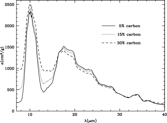 To compute the vertical structure we assume ``astronomical silicate'' (Laor & Draine 1993) and carbon (Preibisch et al. 1993) particles. We used two sets of carbon abundances, leading to a carbon poor disk structure and a carbon rich disk structure. The carbon poor disk structure consists of ``astronomical silicate'' only. The carbon rich disk structure consists of a mixture of 5/6 ``astronomical silicate'' and 1/6 carbon (by mass). We note that the ``astronomical silicate'' opacities are empirically derived, therefore the precise chemical composition responsible for these opacities is not well known. In fact they may contain some contribution from carbon, since they were derived from interstellar dust absorption lines of sight (Draine & Lee 1984).