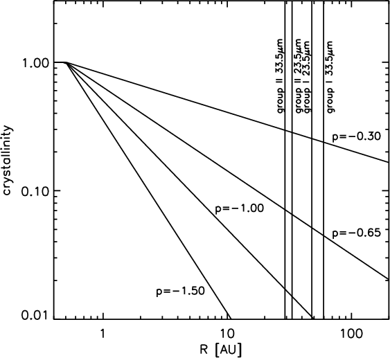 0.6 AU) where diffusion to the outer disk becomes important there should be an equal amount of forsterite and enstatite present. Although the forsterite is expected to be more concentrated to the innermost part of the disk, we will treat the different crystalline silicates as one crystalline component. For the opacity of the amorphous grains we use olivine (Mg2xFe2-2xSiO4). We use three values for the carbon
