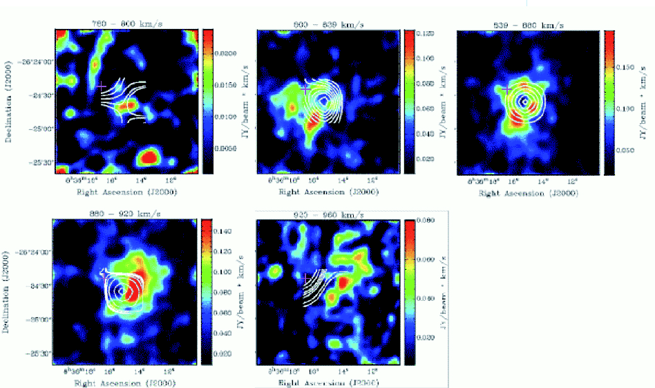 area at a sensitivity of 18 mK. We detected for the first time CO emission at a second velocity of 933 km s-1 at position (20, 20). At position (0, 20) there is also a weak hint of emission in this velocity.