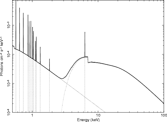 observations. A soft excess is also present, likely due to continuum and line emission from photoionized circumnuclear matter.