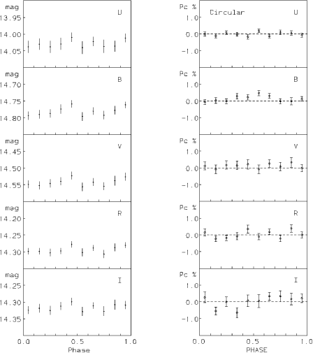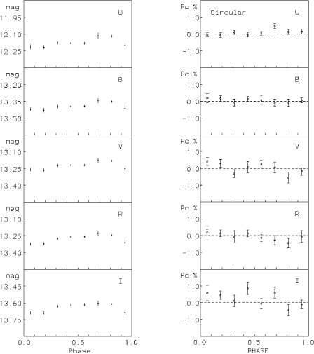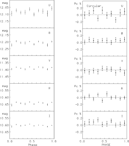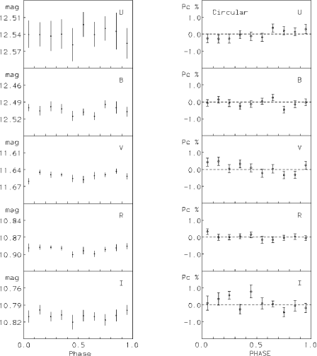 (15.9 mn) showed a coherent modulation, however the variation was within two sigma of being zero. West et al. (1987) also considered the variation of the circular polarization with the passband, they found that the amplitude detected increased with wavelength, ranging from