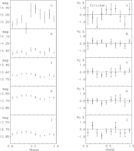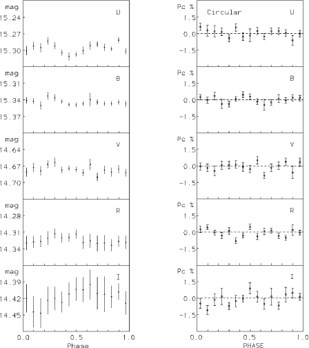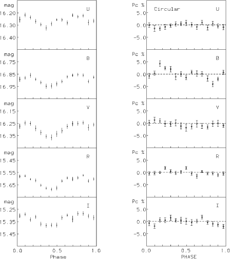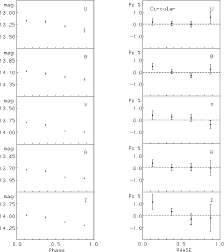 The next detection of circular polarization in an IP was BG CMi (Penning et al. 1986; West et al. 1987). Measurements were taken in five different pass bands at various times over four months. This allowed the measurements to be plotted over the orbital period (3.75 h). In the