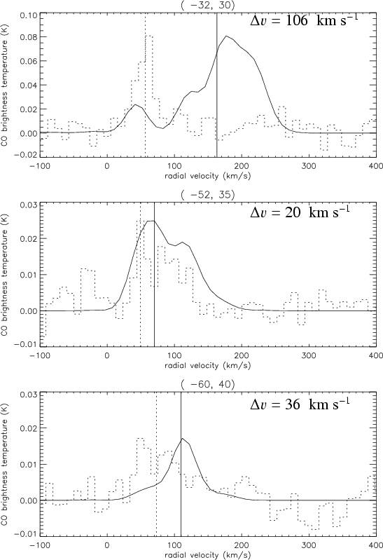 In the galactic disk the relatively high velocity differences of -40 and +30 km s-1are not reliable due to the complex line profiles and effects of H