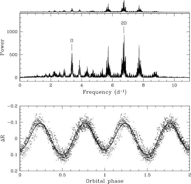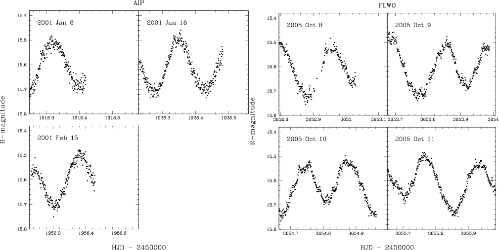 Figure 4 also shows all the R-band data folded on the orbital period using the ephemeris given in Eq. (1). The ellipsoidal modulation is apparent. The shape of the folded light curves, however, shows significant deviations between the AIP and FLWO data. The 2001 January 8 light curve clearly displays the phase-0.5 minimum and phase-0.75 maximum shifted by