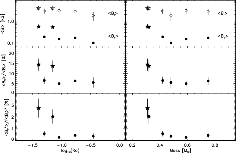 magnetic energy with Rossby number and mass. Uncertainties in the