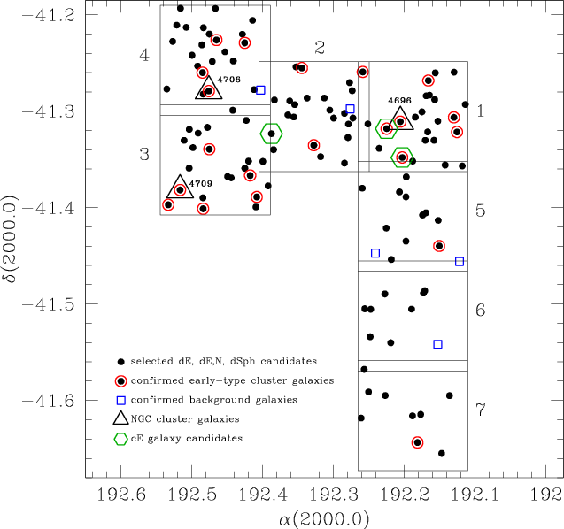 Figure 1: Map of the seven VLT/FORS1 cluster fields (large open squares) with the selected dwarf galaxy candidates, the spectroscopically confirmed cluster members and background galaxies. The major cluster galaxies NGC 4696, NGC 4709 and NGC 4706 are marked by open triangles. Green open hexagons are compact elliptical galaxy (cE) candidates (see Sect. 3.3.2). |