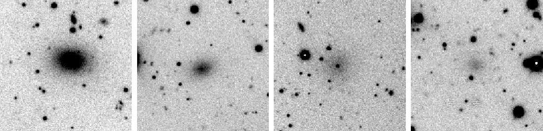 Thumbnail images of four cluster dwarf galaxy candidates that fulfil our selection criteria (two dEs, one dE, N and one dSph). The objects' absolute magnitudes from the left to the right are: