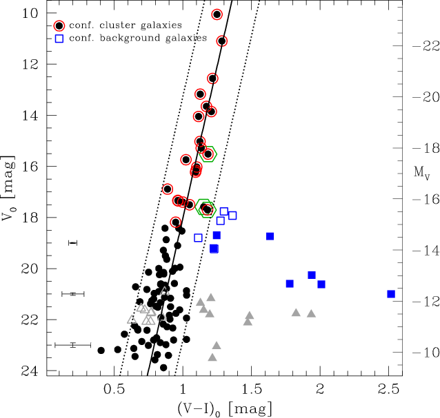 the other two share their position in the CMD with spectroscopically confirmed background galaxies (open squares in Fig. 3). Moreover, Fig. 8 shows that the confirmed background galaxies as well as the seven likely background objects clearly differ from the cluster galaxies, because of their high central surface brightness and their large Sérsic index. We consider 10 more morphologically selected objects with V0>21 mag likely background objects, as their colours are significantly redder than those of other objects in the same magnitude range (see the filled triangles in Fig. 3).