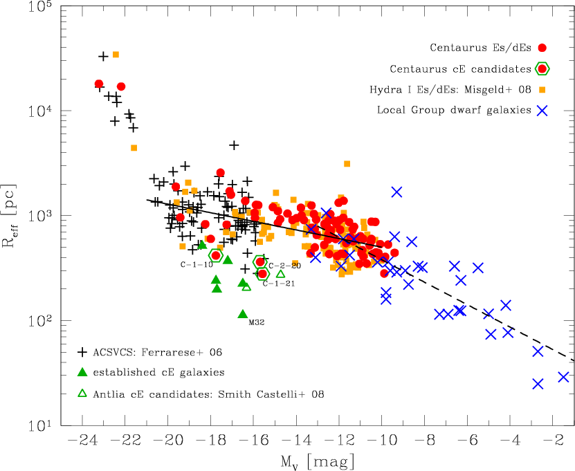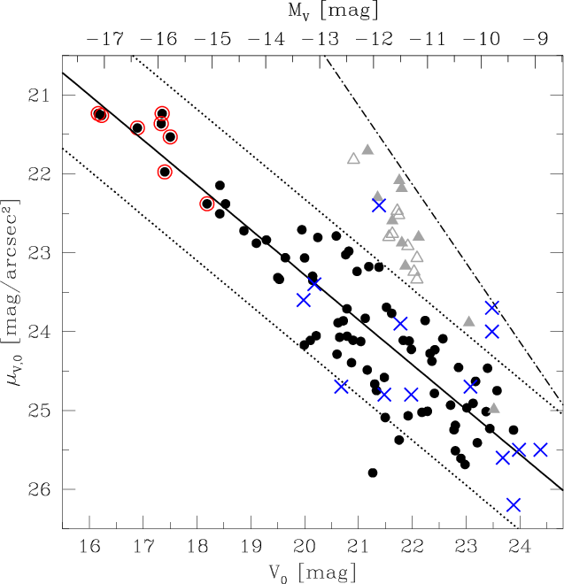 When projected to the Centaurus distance, LG dwarf galaxies are mostly consistent with the same relation, with a few slightly more compact objects (Grebel et al. 2003; McConnachie & Irwin 2006). The likely background objects from Fig. 3 (grey filled triangles) do not follow the relation, but they have central surface brightnesses about 1 mag/arcsec2 higher than other objects of the same magnitude.