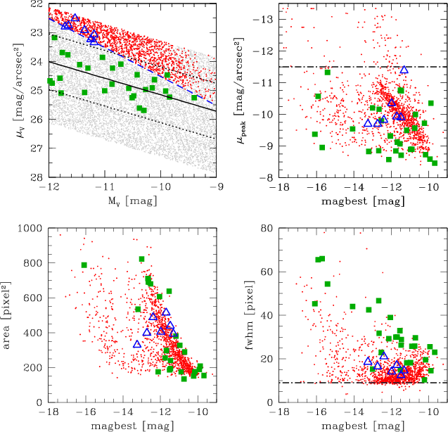 In a second step, we used the SExtractor detection routines to quantify the detection completeness in our data (see also Sect. 3.2) and to find more dwarf galaxy candidates, in particular at the faint magnitude and surface brightness limits. The detection sensitive SExtractor parameters were optimised such that a maximum number of objects from the by-eye catalogue was recovered by the programme. Only 12 of the 89 obvious by-eye detections were not recovered, mostly due to their position close to another bright object or close to the image border. In our search for new dwarf galaxy candidates we focused on those sources in the SExtractor output catalogue whose photometric parameters matched the parameter range of the simulated dwarf galaxies. For this, we applied cuts in the SExtractor output-parameters mupeak, area and fwhm to constrain the output parameter space to the one found for the simulated LG dwarf galaxies (see also Misgeld et al. 2008). We thus rejected barely resolved and apparently small objects with high central surface brightnesses, both being likely background galaxies. The applied cuts are described in detail in Sect. 3.2. In this way, 8 additional objects in the magnitude range -11.0<MV<-9.4 mag were found and added to the by-eye catalogue. On the background field, neither the visual inspection nor the SExtractor analysis resulted in the selection of an object.