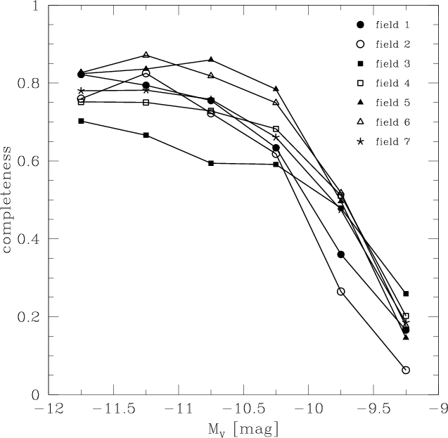 Figure 6: Completeness as a function of magnitude (in 0.5 mag bins) for each of the seven cluster fields (cf. Fig. 1). |