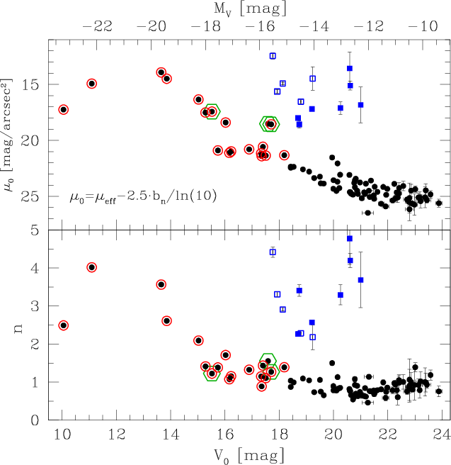 and hR are not given for objects, whose surface brightness profiles are not well described by an exponential law, i.e. objects brighter than V0=16.1 mag and the three cE galaxy candidates (see Sect. 3.3.2). Columns eight, nine and ten give the effective surface brightness