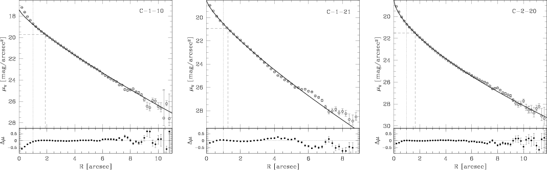 (about 1.5 seeing disks) and the outermost part of the profile, where the measured surface brightness was below the estimated error of the sky background. Corrections for interstellar absorption and reddening were taken from Schlegel et al. (1998), who give AV=0.378 mag and
