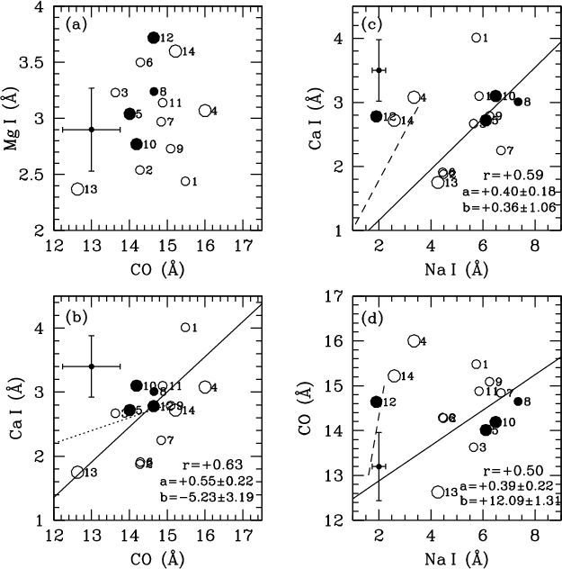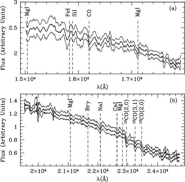 A few prominent NIR features were first studied by Origlia et al. (1993), who demonstrated that they represent a superb set of indicators for constraining the average spectral type and luminosity class of cool, evolved stars. This conclusion was later confirmed by Förster Schreiber (2000) and Ivanov et al. (2004). Furthermore, the same NIR features appear to be promising abundance indicators (Frogel et al. 2001; Stephens & Frogel 2004).