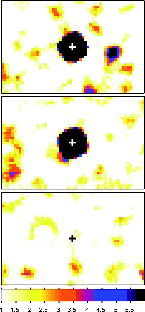 Figure 1: 18-80 keV stacked mosaic significance images for three of the various galaxy subsamples. From top to bottom: Seyfert 1, Seyfert 2 and ``non Seyfert'' subsamples. The color map spans significances between 1 and 6. The color map of the bottom image has been slightly modified to account for the systematics, re-normalizing the centroid of the background distribution to a value of 0. |