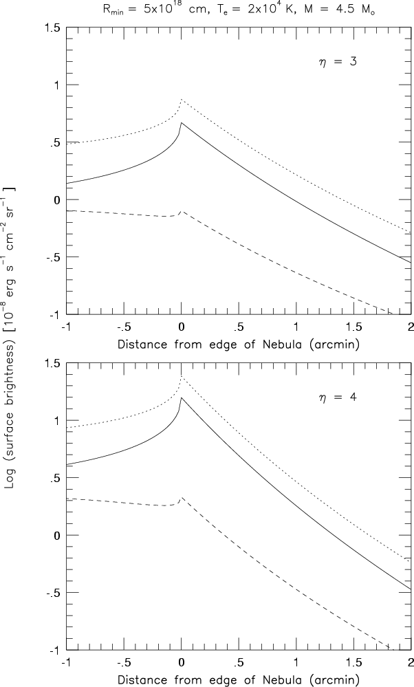 images were obtained with WFI at the 2.2 m MPG/ESO telescope and with MOSCA at the 2.56 m NOT. The data are compared with theoretical expectations derived from shell models with ballistic gas motion, constant temperature, constant degree of ionisation, and a power law for the density profile.
