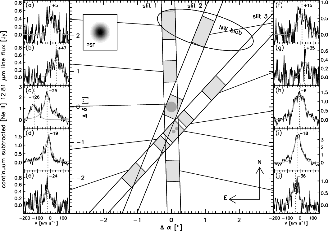 - In slit 3, we sampled the continuum blue-ward of the [Ne II] line between -340 and -75 km s-1, and red-ward of the line between +100 and +430 km s-1.