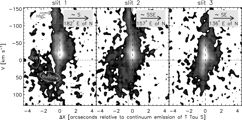 In order to test various hypotheses to the origin of the [Ne II] emission we observed the system with 3 different slit orientations, spatially covering the main components of interest (see Fig. 1). Slit 1 covers the northern and southern component, and is oriented roughly perpendicular to the Sa-Sb separation. Slit 2 covers the northern component and the ``NW blob'', and incidentally catches T Tau S as well, albeit with significant slit losses. Slit 3 covers the southern component, and is oriented along the Sa-Sb separation. All slits cover some of the diffuse gaseous emission seen in deep AO-assisted near-infrared images (e.g. Herbst et al. 2007; Gustafsson et al. 2008; Beck et al. 2008).