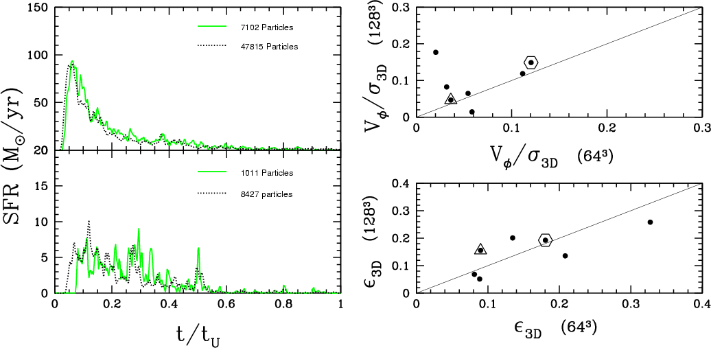 Figure 1 (right panel) presents comparative results of the same objects at z = 0 in the two simulations where we computed the observables introduced above on shape and kinematics. The systems appear to be stable and agreement between the simulations results is good, although one object does exhibit a significant difference. This system is not the least massive in these simulations and the difference is due to the peculiar way in which the