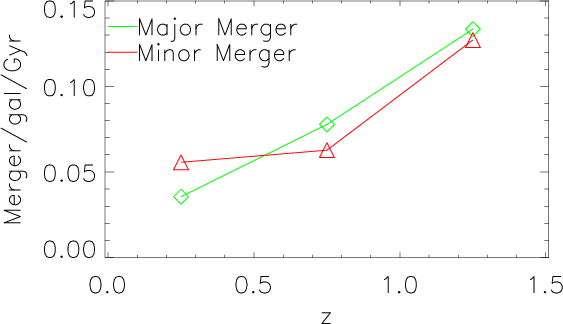 Our simulations predict slightly higher values of this parameter, perhaps related to the active environment conditions modelled in our runs. However, we found that the results are in agreement with Fig. 8 of Genel et al. (2009) and our numbers are consistent with these theoretical works. Finally, Conselice et al. (2009) studied the merger history of a large number of galaxies for z < 1.2. Our results here