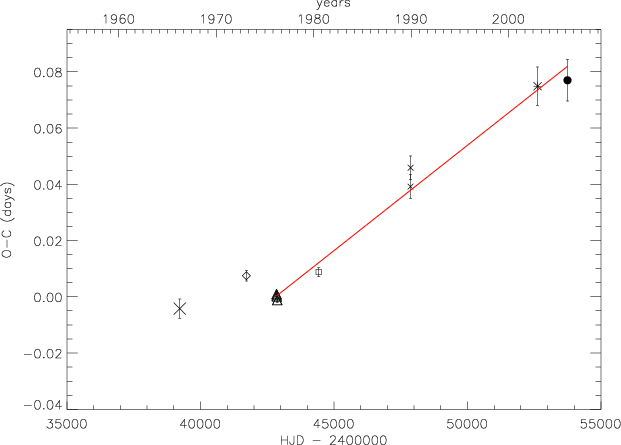 Alecian et al. (2005) we calculated the observed minus computed (O-C) timings of the first conjunction and added our new point to Fig. 3 showing it's evolution over a time span of 30 years. We can observe that the curve seems to decline slightly in gradient, indicative of either the presence of a third body in the RS Cha system or of the signature of changes in the orbital period of the order of